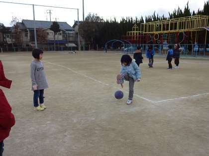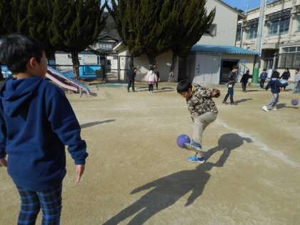 音楽の学習で日本のわらべ歌「あんたがたどこさ」をして楽しみました。グラウンドに出て、ボールをついて足の下を通す動きが難しく「ここまではできたのに」「最後までいきたいのに」と四苦八苦しながらも、工夫を考えどのグループも大変楽しそうにしていました。