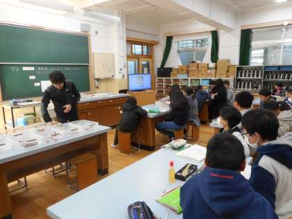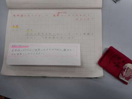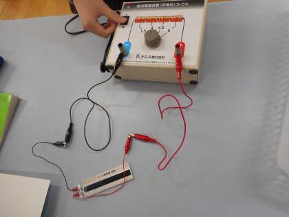 理科「電気とその利用」で電熱線の太さと発熱量の関係を調べる学習をしました。多くの児童が,太い電熱線の方が発熱量が大きいと予想したました。予想の後,実験で電熱線の太さと発熱量の大きさを調べていきました。