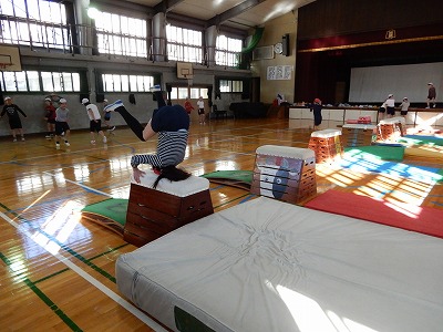 新たな跳び方を習得しようと工夫して練習しています。ゴムを使ったり、ウレタンマットを使ったりと自分が挑戦する技に合わせて場所を選んでいます。