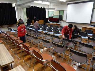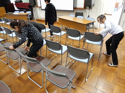 本日、半日入学を実施しました。5年生は直接関わりをもちませんが、半日入学の準備で活躍しました。まずは、保護者説明会の場所を設営しました。