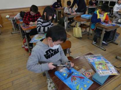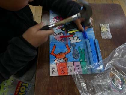 金づちを使って釘を打ちました。初めて金づちを使ったので,「手を間違って打たないかな」「まっすぐに打てるかな」と少し緊張している様子でした。しかし,何回か打っていくうちにコツをつかみ,まっすぐ打てるようになってきました。