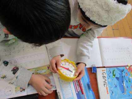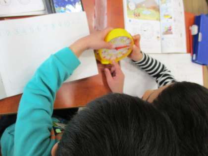 時計の針を動かしたり,時計の絵の周りにお花を書いて数えたりして