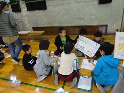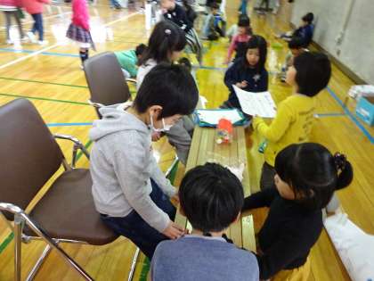 今日は,生活科で1年生とにじの子学級の1・2年生を「あそびの王国」に招待しました。4校時に講堂で準備しました。20コーナー,それぞれ工夫して準備をしていました。