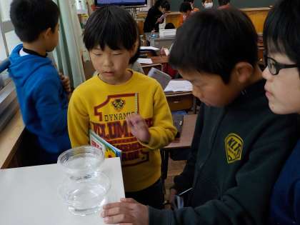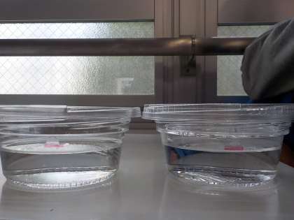 水は熱しなくても空気中に出ていくのか?パックにふたをしたものと,ふたをしていなものとを置いておき,結果を比べました。ふたをしていないパックの水は減っていて,水が「じょう発」していることが調べて分かりました。