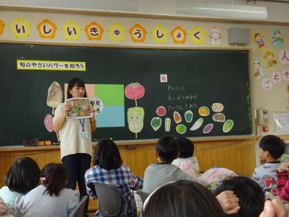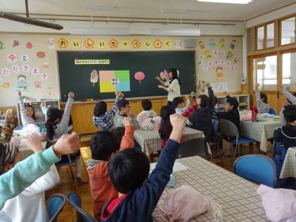 今日は,2年い組が今年度最後のランチルームでした。給食の前に栄養教諭の先生から旬の野菜のことについて教えてもらいました。いろいろな野菜を意識して食べてほしいと思います。