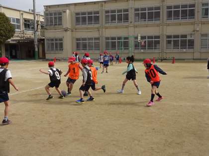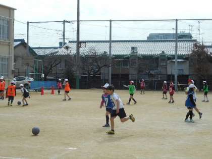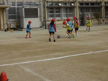 体育の授業でボールけりゲームを行いました。ボールけりゲームの学習は今日で最後でした。子どもたちはどのようにしたら勝てるかの作戦をチームで話し合いながら最後のゲームに挑みました。次の学習は,「ゆっくりかけあし」です。3分間にどれだけ走れるかに挑戦します。