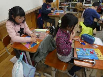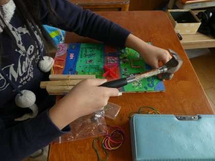 金づちの使い方を学習したので,金づちを使って釘を打ちました。どこに釘を打ったら,楽しいコースになるのか考えながら釘を打っていました。釘の打ち方,釘の抜き方も上手になってきて,教室には「トントン」とリズムよく金づちを打っている音が響いていました。友達が作成した作品を見る中で,友達のアドバイスをもらいながら完成することができました。