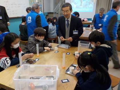 2つめは,実際にモノづくりに挑戦する工房学習です。まずは,実際に企業の方々にお越しいただき,「化学」についてお話や実験をしていただきました。