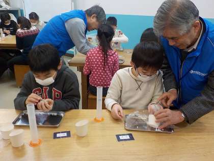 そしていよいよモノづくりのスタートです。子どもたちは苦戦しながらも,発泡スチロールの元となるつぶつぶのビーズを丸い入れ物に一生懸命詰め込みます。その詰め込んだ容器をあたため,ボールを作りました。苦労した分,完成した時の表情は満足げでした。モノづくりの魅力を感じられていたのではないでしょうか?