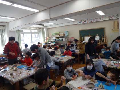 本日、おやじの会主催の、陶芸教室を行いました。立命館大学陶芸部の皆様にもご協力いただき、たくさんの児童や保護者が参加しました。