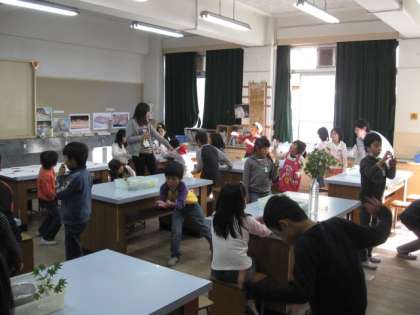 そのあと5年生のお手伝いの子供たちが、2年生には折り紙で作るもみじの種のやり方を教えてくれました。1年生・にじの子学級は5年生の折った色紙の種をもらいました。