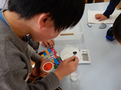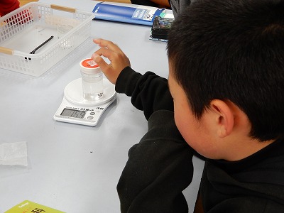 まず比べるために容器の重さを含む水と食塩の重さをはかりました。次にはかった食塩を水の中に入れ溶かしました。さあ重さはどうなっているのだろうか。電子てんびんに乗せ確かめました。