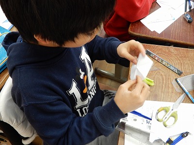 算数科で円と正多角形の性質に迫るために、紙で多角形を作りました。そして、その多角形を調べることを通して、辺の長さ、角の大きさが等しいことから正多角形であるということを学びました。