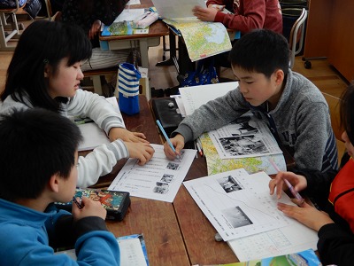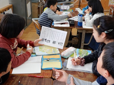 社会科で「環境を守るわたしたち」の学習を始めました。3枚の資料をグループで話し合いながら見ました。複数の資料から共通点を見つけたり、関連する点を見つけたりしながら調べました。