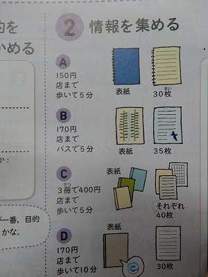 家庭科で異なる4種類のノートを買うという設定で学習を進めました。「物の品質や価格などの情報を集め、整理すること」の大切さを意識することで、何が自分に必要な物なのか考えることができました。