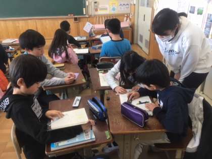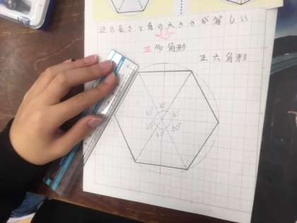 算数では、コンパスを使って正六角形の作図のしかたを学びました。なぜこの描き方で正六角形になるのかを考え、交流しました。