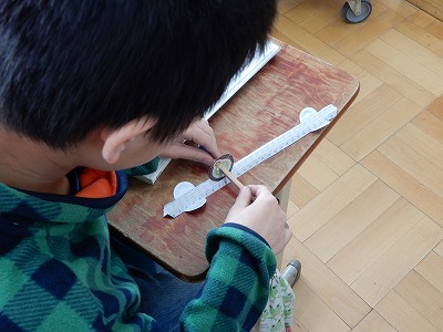 円周と直径の関係を調べるために、円周測定マシーンを作りました。今日は直径4cmの円で調べました。他の大きさの円についても調べていきます。規則性に気付けるでしょうか。