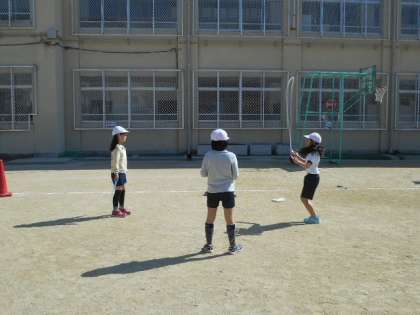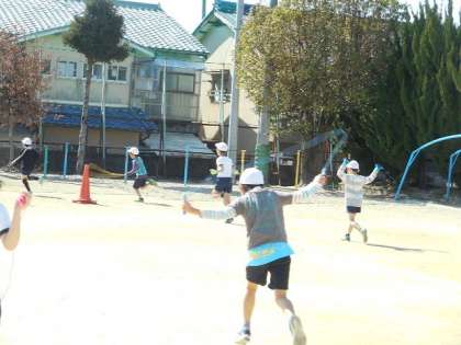 ウォーミングアップに,なわとびを使って約100mをかけあしとびで走りました。走り終わった子どもから好きな跳び方で楽しく跳んでいました。