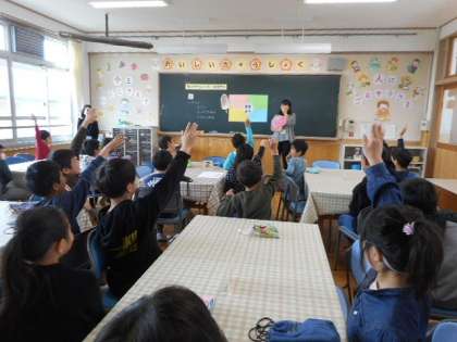 クラスで楽しくランチルームで給食を食べました。給食を食べる前には,栄養教諭から「旬の食べ物」についてお話をして頂きました。子どもたちは,お話を聞いたり,グループで話し合ったりして楽しそうに活動していました。普段の給食時間にも,前回に教えてもらったお箸の持ち方などを意識しながら食べるようにしています。