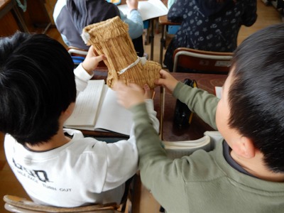 国語科で「わらぐつの中の神様」の学習をしています。物語の中で出てくる「わらぐつ」を実際に見せました。
