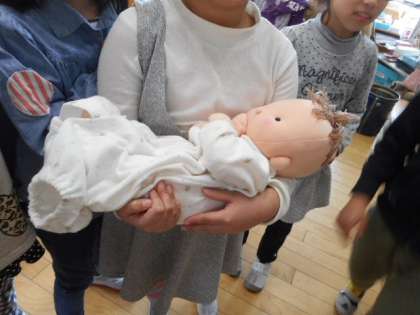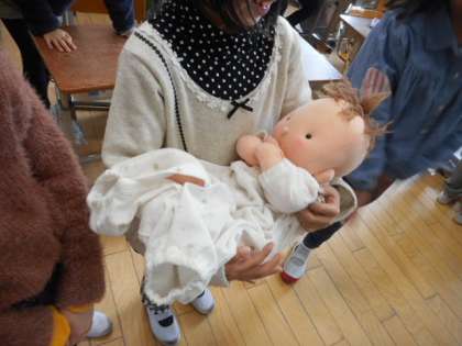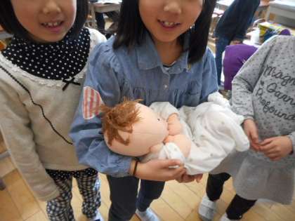 2月27日(火)の授業参観時に行った「いのちのはじまり」という授業で使った赤ちゃんの人形を抱っこしました。生まれたての赤ちゃんの重さを知って驚いていました。