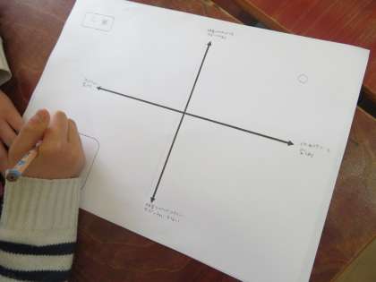 衣笠デイサービスセンターへ訪問して実施する,「金閣スマイルプラン」の案をよりよいものにするためにアイデアを出しあいました。座標軸というツールを使って,視点を明確にしてから他のグループの案にアドバイスをし合いました。