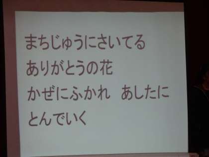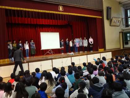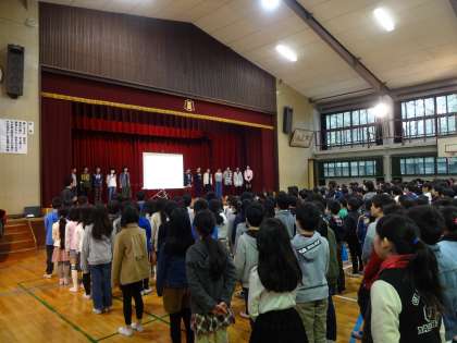 集会委員会は、先月投票した東京オリンピックパラリンピックマスコットの結果紹介に続き、毎月歌っている「ありがとうの花」の全校合唱をリードしました。