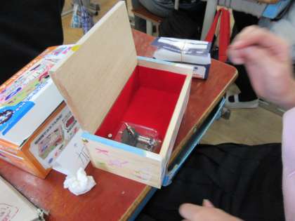 子どもたちは,内面に赤いシートを貼りつけた後,オルゴールを設置しました。