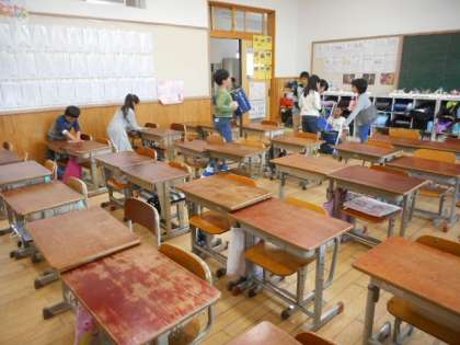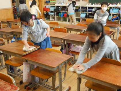 掃除が終わったら,いいところと直したほうがいいところに気付いた班が発表するという時間を取っています。最近は,机を拭くときに荷物があると拭きにくいため,「机の上の荷物を全員が片づける」ということを,目標にして掃除に励んでいました。その目標を,昨日達成することができ,子どもたちは大変喜んでいました。