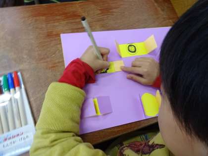 今日は,小雨が降ったり,グランドに大きな水たまりがあったりで体育を中止にしました。その代わりに,図画工作の「まどをひらいて」の続きをしました。窓を開くと何が見えるのか考えながら,カラーペンで楽しく描いていました。