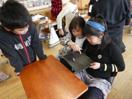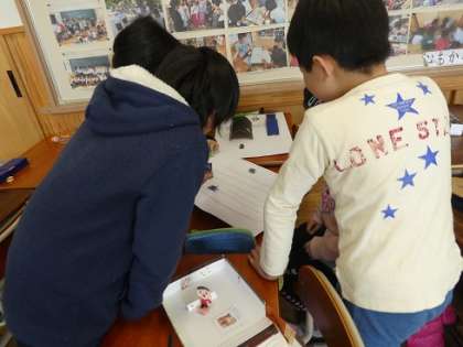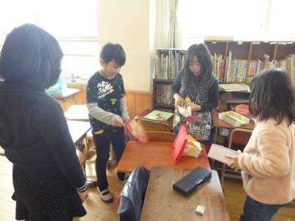 今まで学習したことを使っておもちゃを作ったので,どんなものができたのか,交流をしました。同じ学習のはたらきや性質を使った遊びでも,それぞれいろいろなアイデアを出しておもちゃをつくっていました。友達の作品で遊んだり,友達の説明を聞いたりする中で,一年間の学習を振り返ることができました。