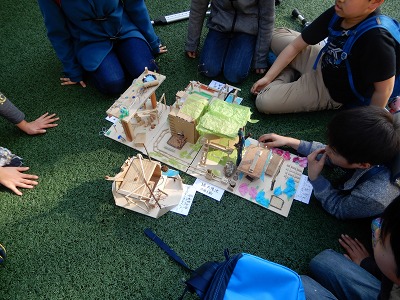 図工展でもご覧頂いた立体作品を子どもたちが中庭で合体させていました。少し小さな町ができていました。