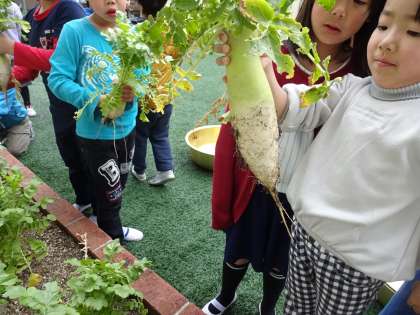 今日は,今まで育ててきた大根を調理するということで朝から子どもたちはウキウキしていました。朝休みに代表の子に,大根を抜いてもらいました。思っていたよりも大きく育っていて子どもたちは,大喜びでした。