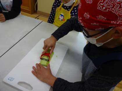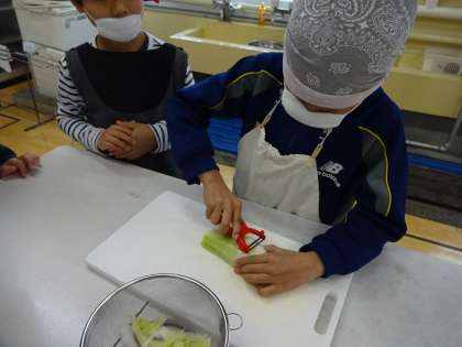 2校時は,い組がピーラーで皮をむきました。初めての子もいましたが,順番に上手に皮をむいていました。