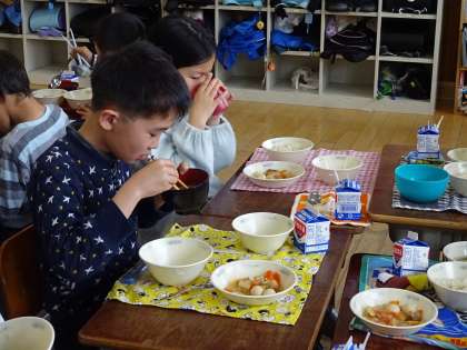と言って飲んでいました。何杯もおかわりする子もいて,作ったみそ汁は全部なくなりました。今年度いろいろな野菜を作ってきました。「育てる楽しみ」・「作る楽しみ」・「食べる楽しみ」を味わった1年間でした。