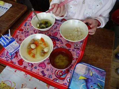子どもたちが皮をむいた大根はいちょう切りにし,葉っぱも細かく切ってみそ汁の具としました。給食時間に,大根のみそ汁としていただきました。ちょっとすじがある大根もありましたが,子どもたちは