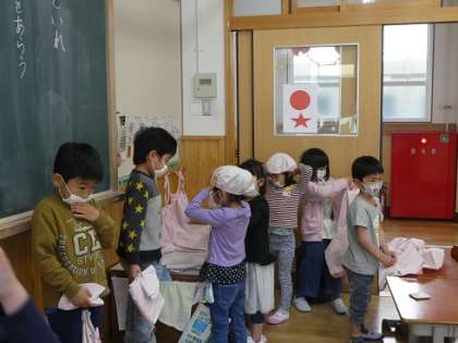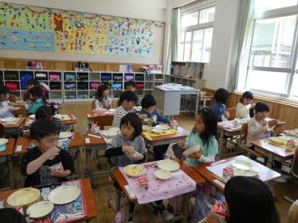 一年生にとって初めての給食。一つ一つ確認をしながら,給食当番の仕事をしていました。「もっと当番の仕事をしたいな。」と,当番の仕事を楽しみながら,一生懸命取り組んでいました。「いただきます」「ごちそうさま」も元気いっぱい言うことができました。