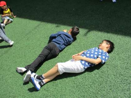 中庭に集まってゴロゴロする人,