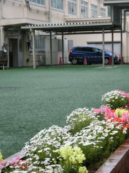中庭の花壇に,栽培委員の子どもたちの手を借りて,きれいな花を植えました。もう見ていただいている保護者の方もいるかと思います。花に彩られた中庭。とても素敵です。今日はあいにくの雨で子どもたちは遊べず残念ですが,植物たちは雨を浴びて喜んでいるかもしれません。