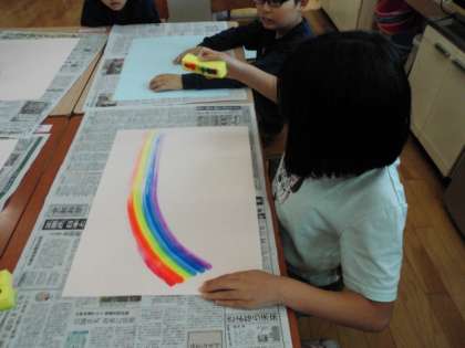 15日の図工は,「にじをかけよう」という学習をしました。虹の歌を歌ったり,実際の虹の写真を見たりした後に,虹を一気にかける魔法のスポンジで,虹をかきました。スポンジに7色の絵の具をのせて紙の上で思い思いに伸ばすと,きれいな虹ができました。