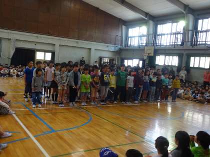 1年生を迎える会のトップバッターは、4年生です。元気いっぱいの歌声を体育館に響かせていました。
