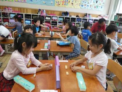 10までの数がいくつといくつになるのか学習しています。カードを2枚めくって9を作るゲームや,さいころをふって2つで7の数をつくるゲームなど,楽しみながら数の学習をしています。いくつといくつに分かれるのか,子どもたちはゲームを通して学んでいます。