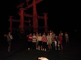 厳島神社の鳥居の前で「ハイ!チーズ!」ライトアップされた厳島神社は幻想的で,とてもきれいでした。「一緒に写真を撮ろう!」と楽しそうな声がたくさん聞こえており,素敵でした。みんなの笑顔がとても良かったです!