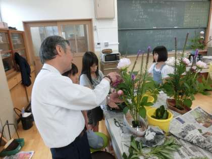 今日のテーマは「シャクヤクを生ける」です。子どもたちは中村先生のご指導の下,茎の高さを微妙に調節しながら,生け花を楽しんでいました。