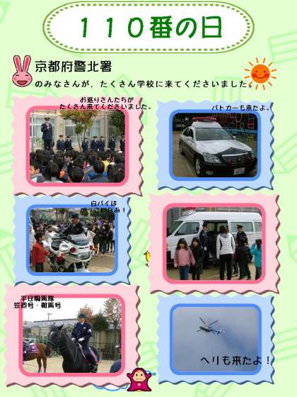 北警察から,12名の警察官のみなさんと,平安騎馬隊から4名の警察官のみなさんに来ていただき,警察車両を持ってきていただいた中で,110番の通報についての意味や「いかのおすし」についてお話をいただきました。
