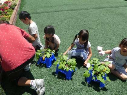 アサガオが成長してきたので,間引きを行いました。子どもたちが毎日水やりをしていく中で,「つるがのびてきた。」ということに気が付いたので,つるが絡まらないように支柱を立てました。「もっと大きくなってね。」と声をかけながらそっと支柱を立てることができました。