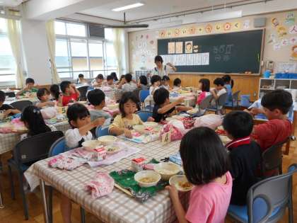 先日学校探検で訪れたランチルームで初めて給食をいただきます。