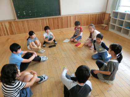 今日は顔合せの日だったので,円になって自己紹介をしました。緊張してなかなかお話のできない1年生に,高学年が優しく声をかける姿が見られました。