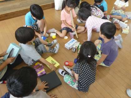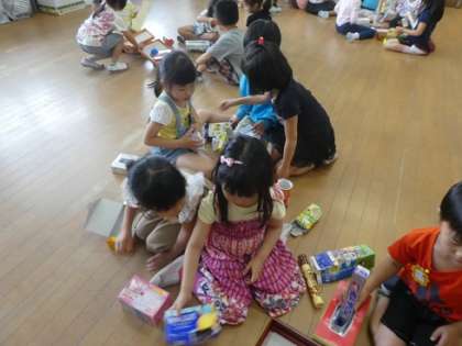 いろいろなはこを積んだり,触ったりして,いろいろな形を作りました。「この箱は丸いからタイヤに使えそう。」と,はこの形の特徴を見つけて,色々な形を作ることができました。