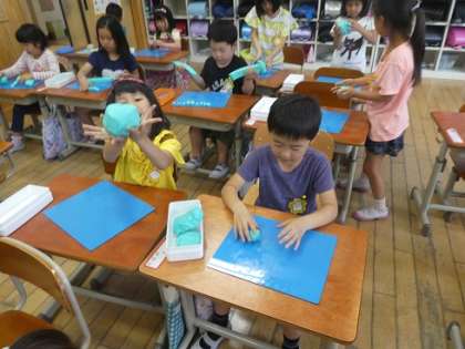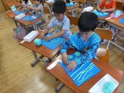 ねんどを丸めたり,伸ばしたりして色々な形を作りました。どこまで伸びるのか試してみたり,伸ばした粘土をくるくる巻いて,うずまきをつくったりすることができました。